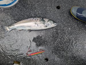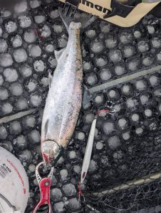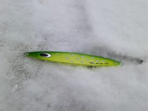 ジグの重さは潮次第でだいたい100g~250gを使う。サクラマスが泳いでるレンジにジグがあるかどうかの運的要素も強いので軽いから釣れる、重いから釣れにくいというわけでもない